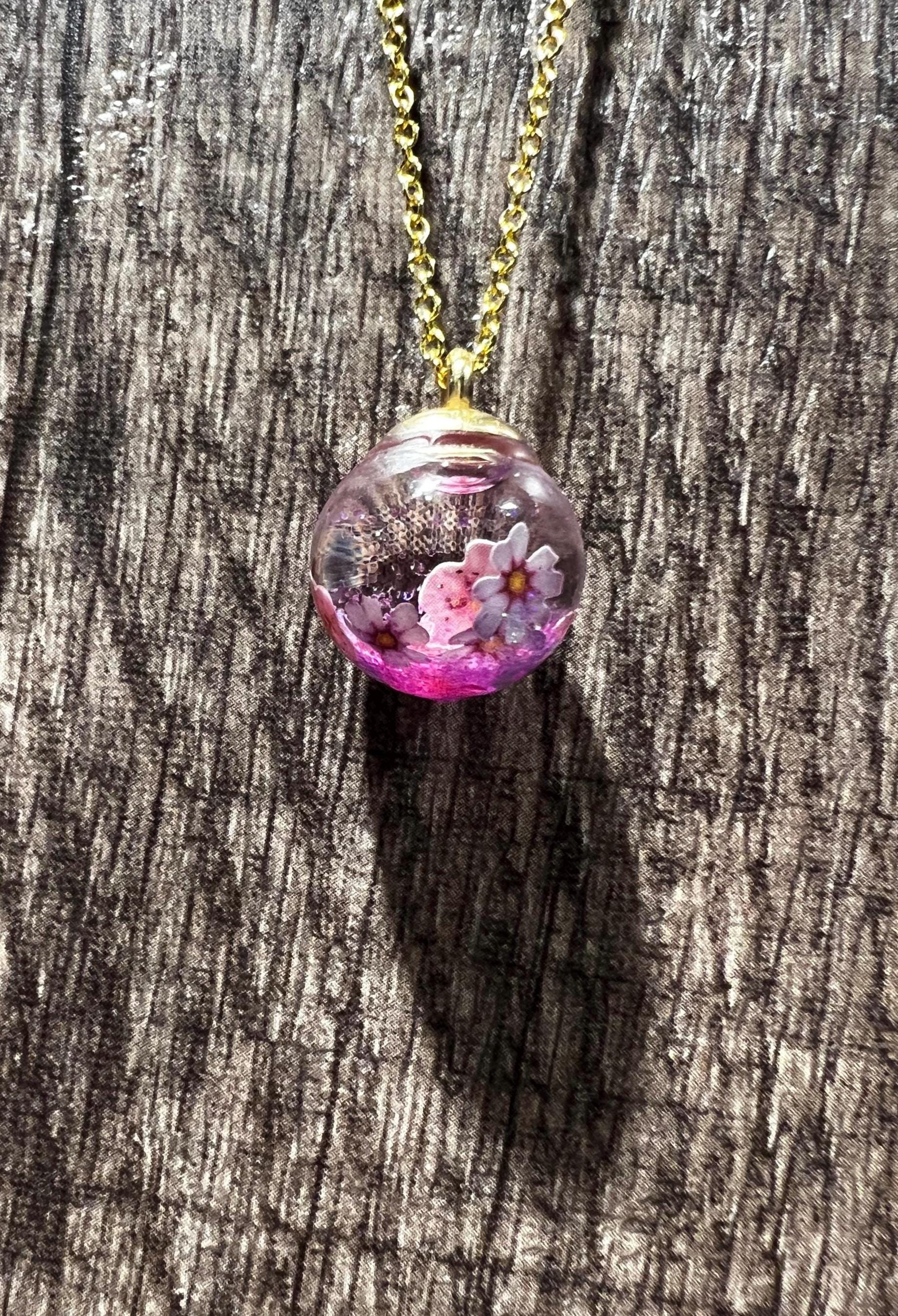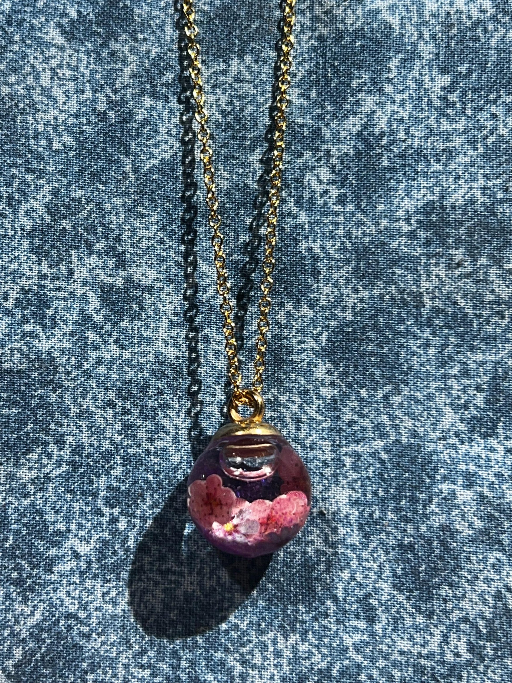 24" gold-plated necklace, featuring a liquid filled bauble with pink and purple flowers and shimmer. One of the first of these pendants I made like this and I am excited to share them - like personal snow globes!