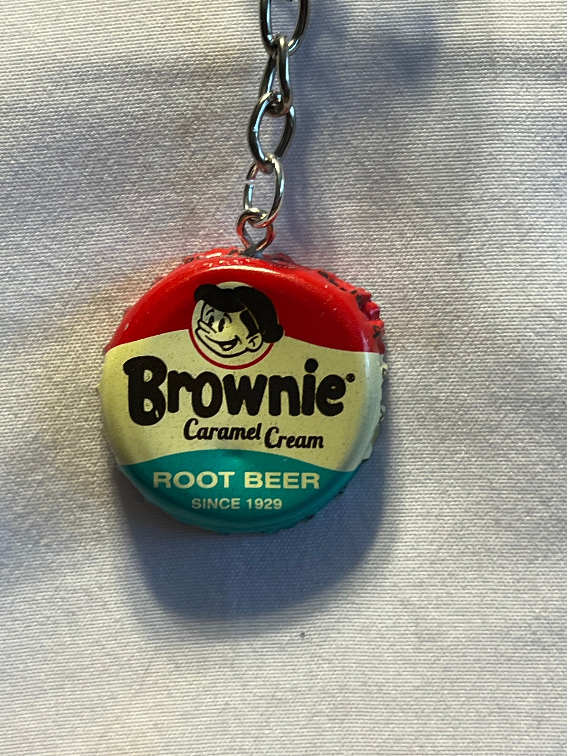 This handmade lucky four-leaf clover keychain features a real four-leaf clover preserved in resin and set inside an authentic Brownie Caramel Cream Root Beer bottle cap, blending natural symbolism with vintage feel.
