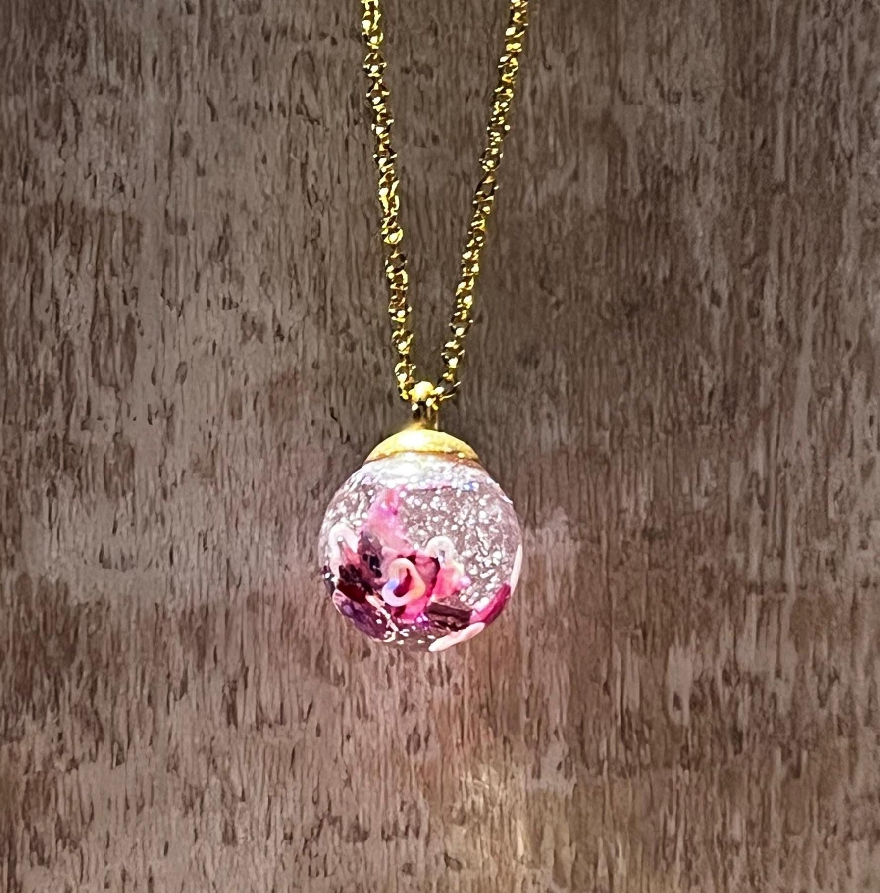 24" gold-plated necklace, featuring a liquid filled bauble filled with vibrant violet mother of pearl, iridescent shimmer, and white hearts. A truly beautiful, dainty pendant - a personal, one of a kind, snow globe!
